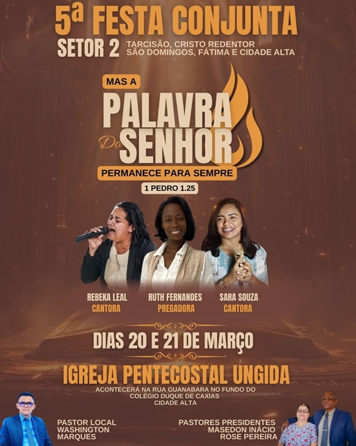 Com o tema “Mas a Palavra do Senhor permanece para sempre” (1 Pedro 1:25), o evento acontecerá na Rua Guanabara, no fundo do Colégio Duque de Caxias, no bairro Cidade Alta, e contará com a participação de cantoras e pregadora convidadas que estarão ministrando durante a programação.