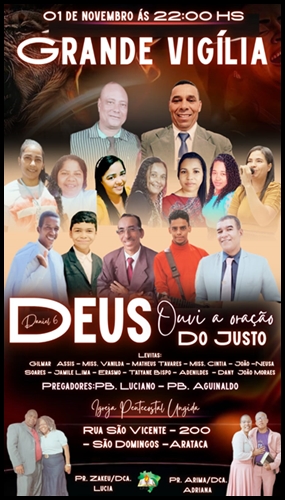 Na noite do dia 1º de novembro, às 22h, a Igreja Pentecostal Unida, localizada na Rua São Vicente, nº 200, bairro São Domingos, Arataca, realizará uma Grande Vigília com o tema inspirado em Daniel 6 – “Deus ouviu a oração do justo”. O evento promete ser uma noite de intensa busca pela presença de Deus, louvor e ministração da Palavra.