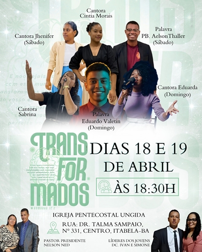 A Igreja Pentecostal Ungida (IPU) da cidade de Itabela-BA se prepara para viver dois dias especiais com a realização do Congresso de Jovens “Transformados”, que acontecerá nos dias 18 e 19 de abril, sempre às 18h30.